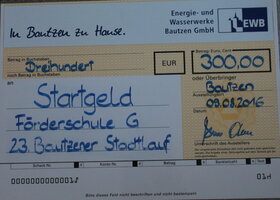 Einige Schüler haben erfolgreich am Bautzener Stadtlauf teilgenommen. In diesem Jahr wurde unsere Schule ausgewählt, eine finanzielle Unterstützung zum Stadtlauf zu erhalten. Die Laufshirts wurden von Energie- und Wasserwerke, der Kreissparkasse und vom Sportrhaus Timm aus Bautzen gesponsert. Den Erlös des Versorgungsstandes am Haus der Sorben wurde unserem Fördervereinskonto zugeschrieben. Herzlichen Dank!
